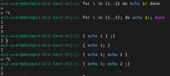 # 'echo 1 }' 하면 '}' 까지 프린트된다. 인수와 구분을 위해 ; 를 붙여야 한다
