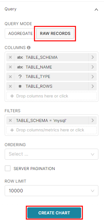 데이터에 대한 통계가 필요하지 않으므로 QUERY MODE를 RAW RECORDS로 변경했다. 그리고 조회할 컬럼을 추가하고, 필터링을 추가한다.