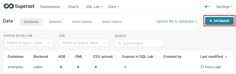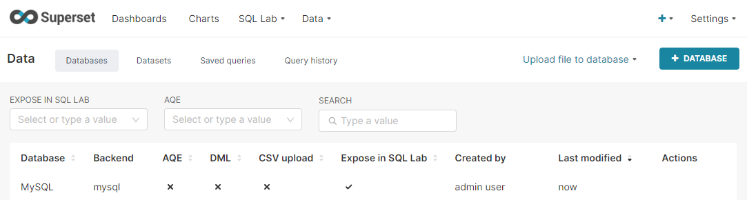 Superset 접속 후 상단바에서 Data > Databases 이동한다.