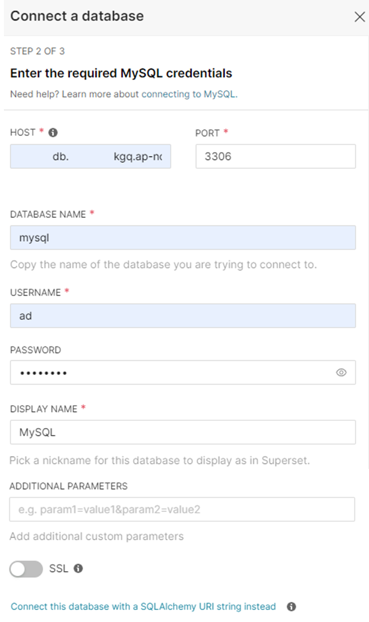 2023.02.21 - [Superset] 설치 및 실행 에서 Superset을 설치해 보았다. 이 글에서는 Superset에서 시각화할 데이터가 저장된 데이터베이스 연결을 해보도록 한다. 사용할 데이터베이스는 AWS RDS MySQL 8.0.28 엔진이다.
