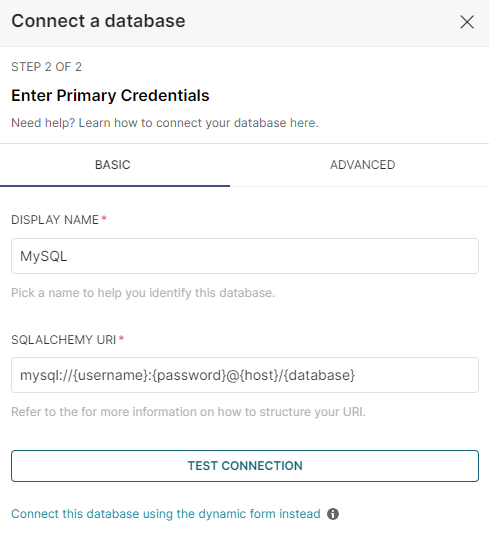 하단의 Connect this database with a SQLAlchemy URI string instead를 클릭해 설정해도 된다. 공식 문서는 SQLAlchemy URI 위주로 작성되어 있는 것 같다.