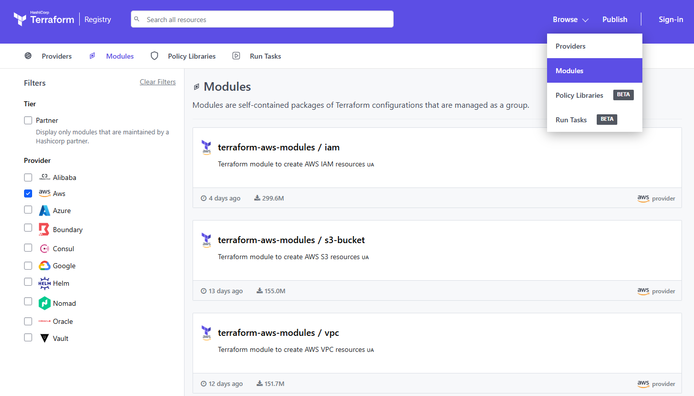 Terraform에서의 Modules란 재사용할 수 있는 구성 세트를 뜻하는데, 여러 리소스와 데이터 소스를 포함한 인프라 배포를 일관성 있게 관리할 수 있게 한다. 다른 프로그래밍과 마찬가지로 재사용성을 위한 개념이다. Provider와 동일하게 테라폼 레지스트리에서 제공하고 있으므로 제공되는 모듈을 사용할 수 있고, 자체적인 모듈을 생성해 공유할 수도 있다.