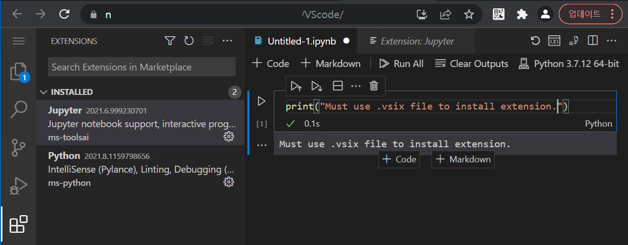 참고로 python을 설치하면 jupyter가 자동으로 함께 설치될 텐데 삭제 후 VSIX로 재설치해야 했다. 버전을 변경하는 방식으로는 문제가 해결되지 않았다.